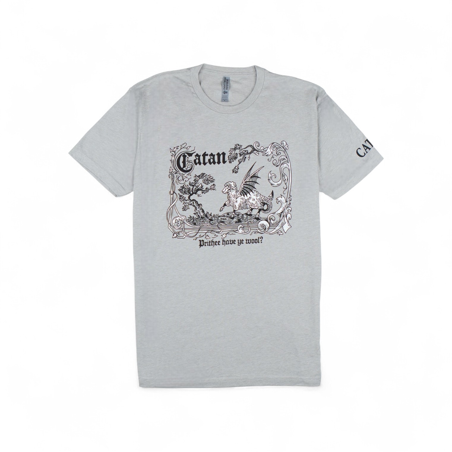 Answer the call of adventure—and wool—with the CATAN Have Ye Wool Tee. Featuring an ornate medieval-style illustration of a dragon set within a fantasy scrollwork frame, this design brings a playful edge to the world of CATAN. With bold lettering that reads “Prithee have ye wool?” and an official CATAN logo on the sleeve, this soft, lightweight tee is perfect for fans who appreciate both epic quests and strategic sheep trading.